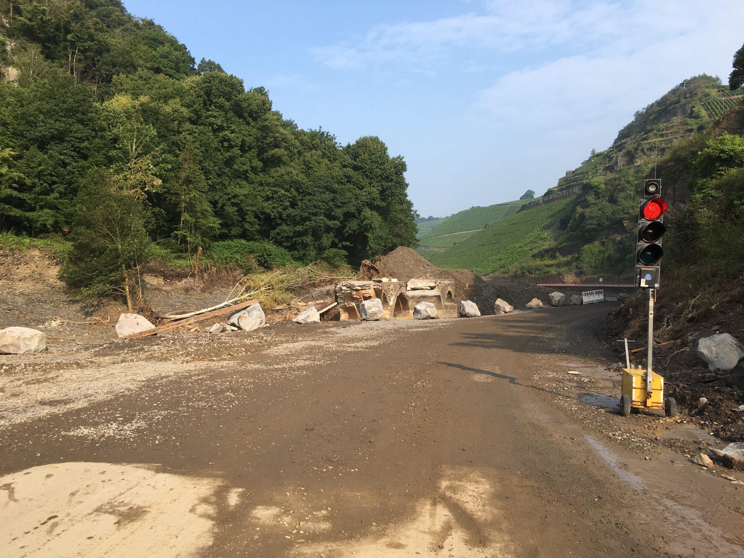 Nach der Flut an der Bunten Kuh sind zerstörte Brücken und eine zerstörte Straße zu sehen.