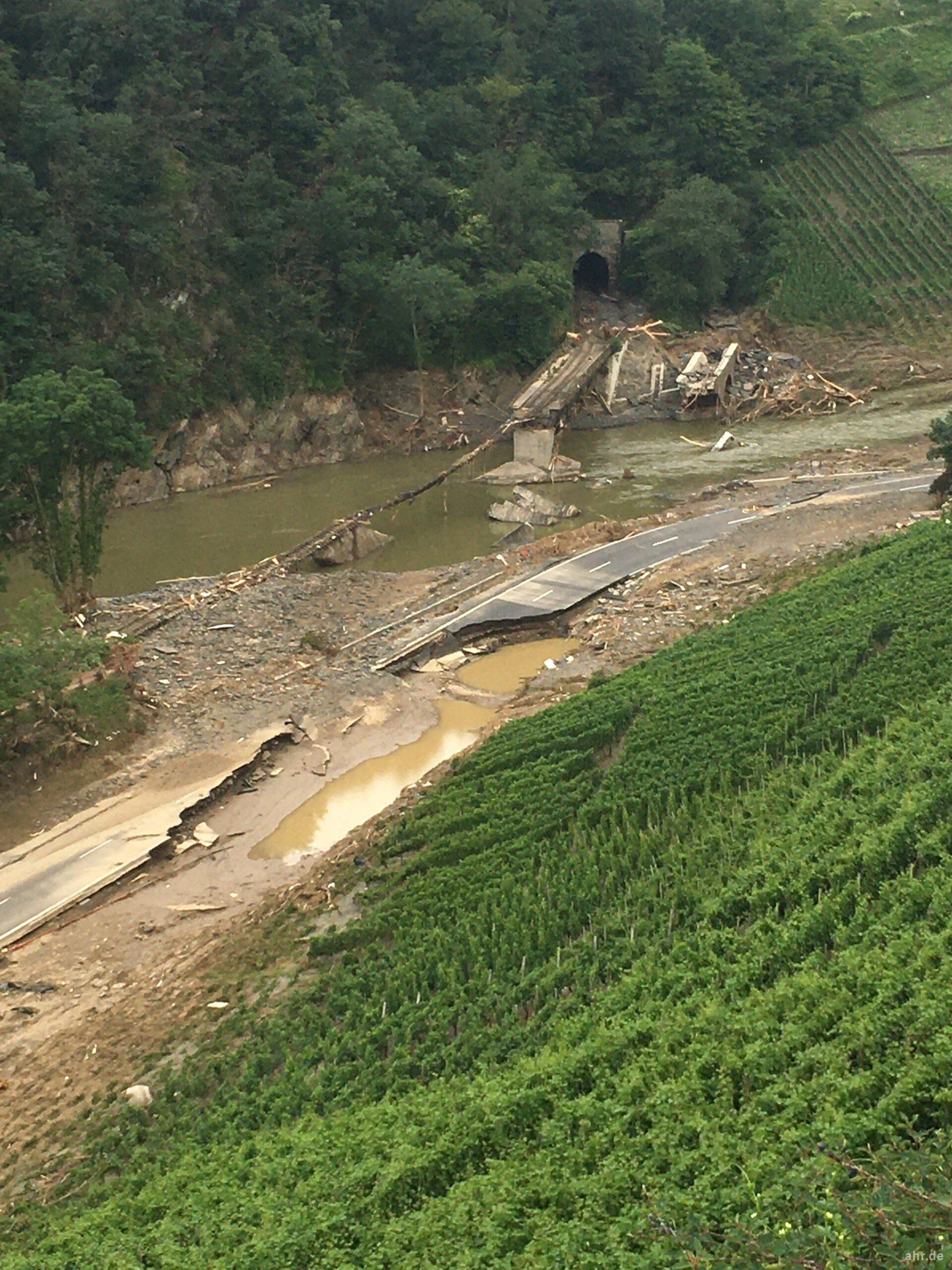 Das Bild zeigt die Trasse der Ahrtalbahn am Saffenburgtunnel unterhalb der Saffenburg zwischen Rech und Mayschoss, im Jahr 2021 kurz nach der Flut.