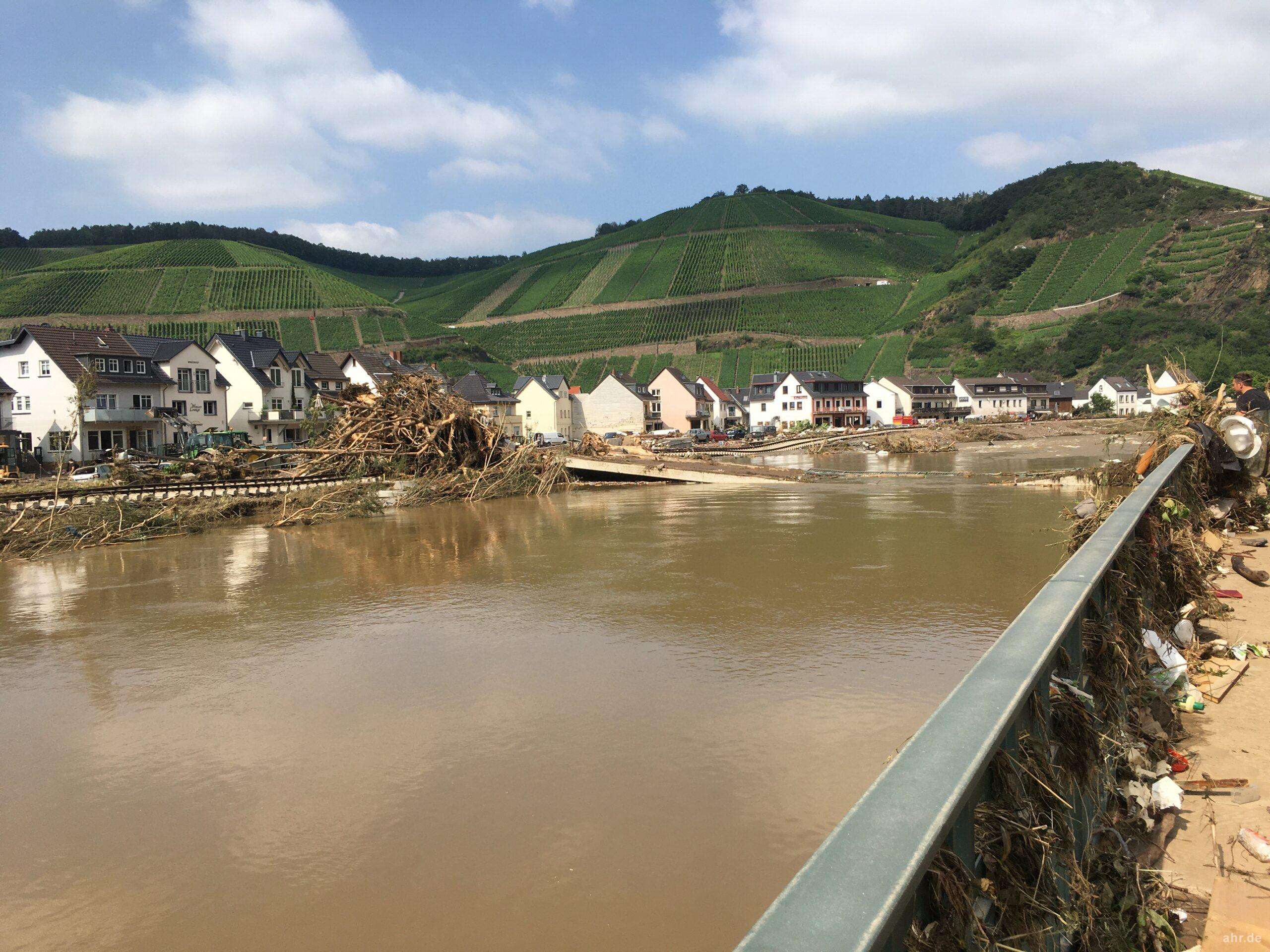 Die Weinbaubrücke in Dernau ist zerbrochen und liegt in der Ahr.